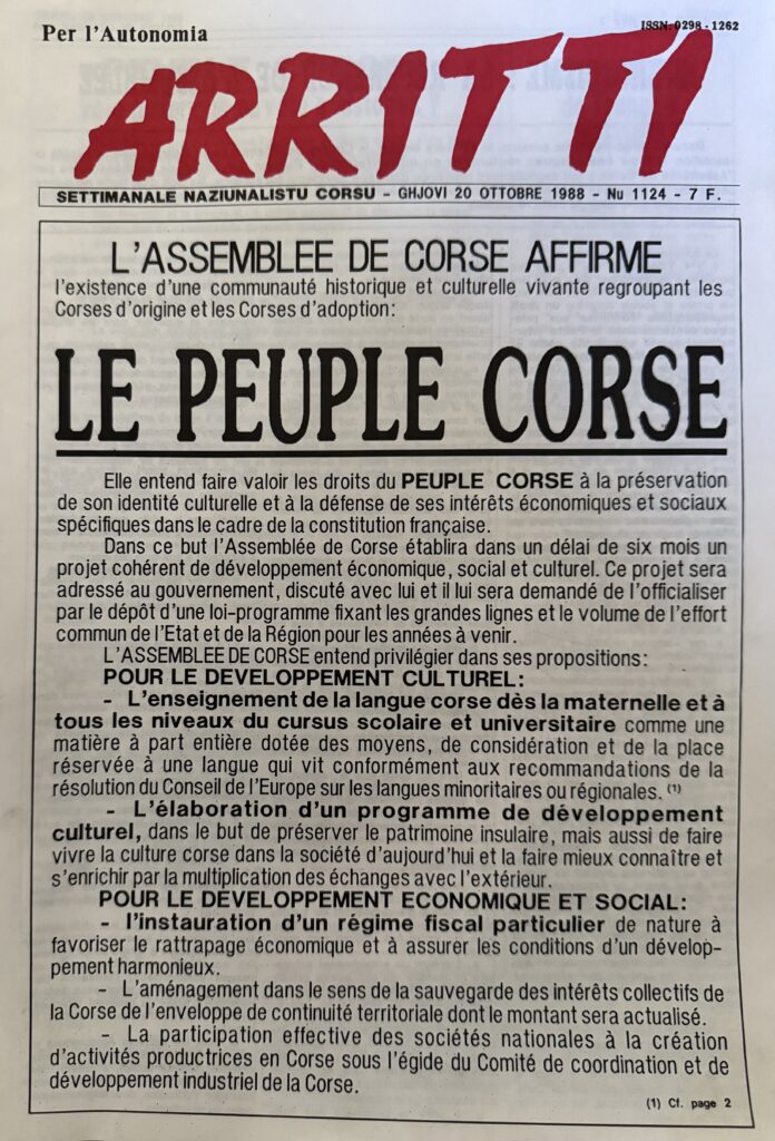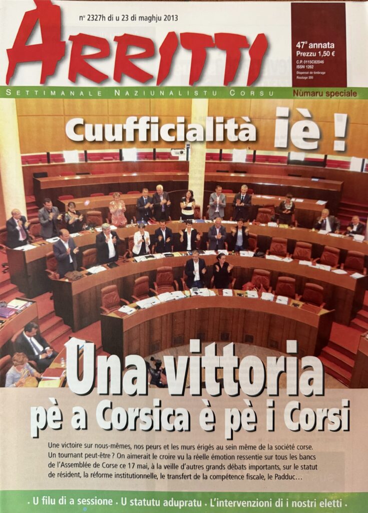 37 anni dopu à a muzione sulenna nant’à l’esistenza di u pòpulu corsu vutata da l’Assemblea di Corsica in u 1988 è chì dicìa u drittu di ssu pòpulu à parlà è prumove a so lingua ; 12 anni dopu à a muzione ancu di più sulenna di l’Assemblea di Corsica per dumandà un statutu di cuufficialità di a lingua corsa cù a lingua francese in 2013 ; 10 anni dopu à l’adopru di u Padduc chì brama a cuufficialità di a lingua corsa, cum’è d’altronde a ricunniscenza di u pòpulu corsu è un statutu di residente per luttà contr’à a speculazione immubiliare, è cunsacra a cultura cum’è « pilastru » di u sviluppu durèvule ; 33 anni dopu à a lege Toubon in 1992 è à l’adopru di u famosu artìculu 2 di a Custituzione chì dice « a lingua di a Repùblica hè u francese » ; quattru anni dopu à l’adopru di a lege Molac chì dice chì « e lingue regiunale appartènenu à u patrimoniu di a Francia », u Cunsigliu di Statu impone torna un interpretazione stretta di a custituzione è una visione settarista di u drittu. Pè a più alta ghjuridizzione francese, l’impiecu di a lingua corsa ùn pò esse autorizatu à u senu di l’Assemblea di Corsica. Hè un disprezzu insuppurtèvule è una sfida à a demucrazìa. Vultèmuci !