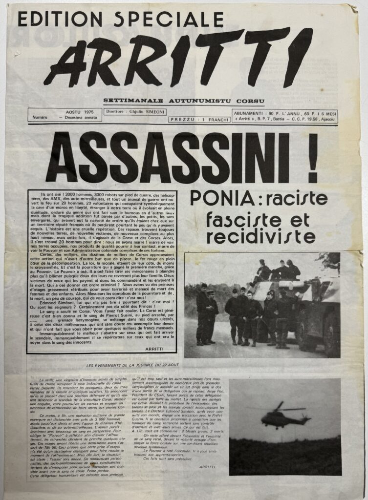 À l’époque d’Aleria, l’imprimerie est située à Toga et Edmond Simeoni prend une part active à l’animation du titre. Aussi, lorsqu’il est emprisonné, le journal se retrouve orphelin. Mais l’équipe ne se laisse pas abattre. Dans la nuit du 22 au 23 août, une édition spéciale est imprimée à 20.000 exemplaires, exposant les principales motivations de l’action de l’ARC, le déroulé des évènements, les photos-choc, et dénonçant les responsabilités de l’État. Les militants dans la nuit s’organisent pour diffuser cette édition spéciale dans toute l’île et jusque sur le continent. Arritti prend donc une grande part à la diffusion de la vérité sur le drame.